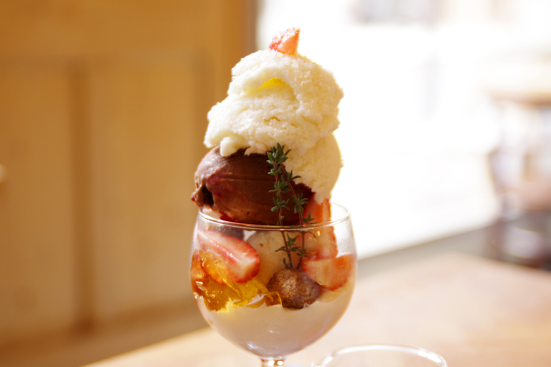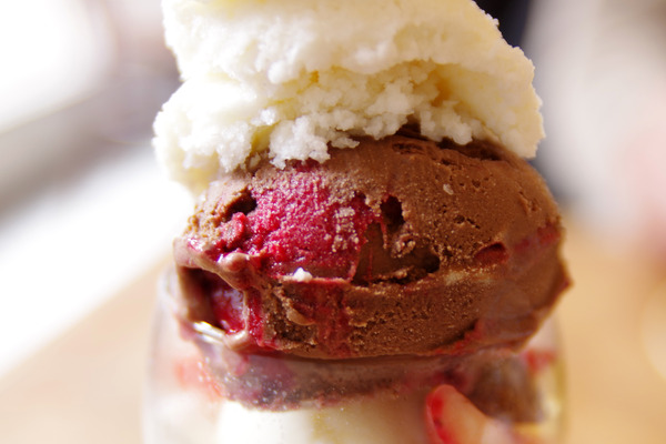 上からカルダモンのグラニテ、チョコレートとフランボワーズのアイス…