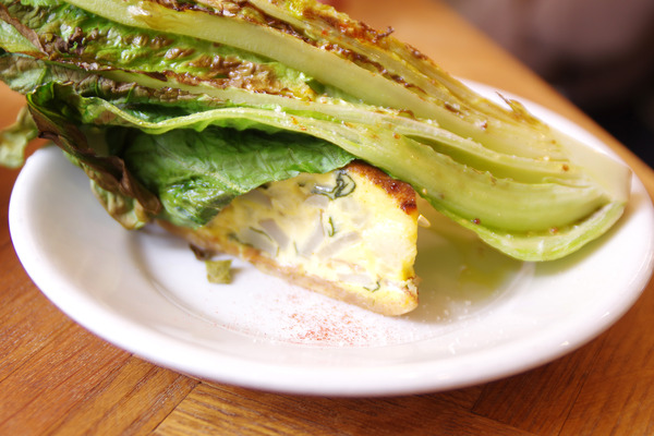 向かいに座った私側からは、ソテーされたロメインレタスがキッシュを覆い尽くしています!いずれのお皿にもたっぷりの添えもの野菜があるのが、本当に嬉しいですね。