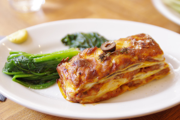 セットのお食事メニューより「根菜ラグーのラザニア」をチョイス。牛蒡など食感の良い野菜にひき肉をあわせたソースと平打ちパスタ生地を重ねたラザニアは、ミルフィーユのような細長いフォルムをカットしながらいただきます。添えられたほうれん草はガーリック風味のオイル蒸しで、シンプルで食べ応えのある好みの味わい。。