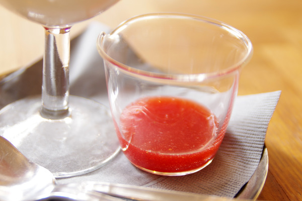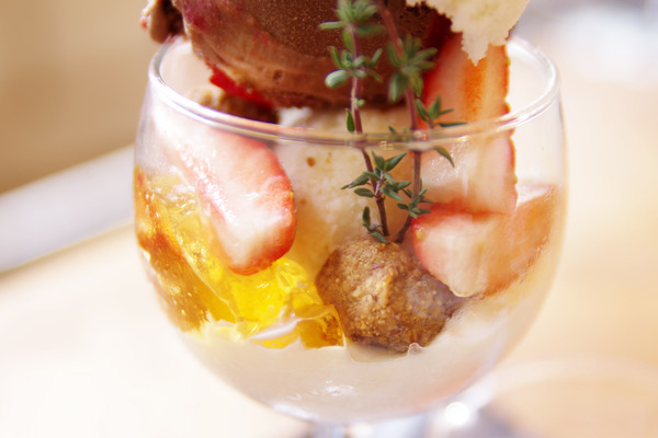 ゴロゴロのクランブル、琥珀色のエルダーフラワーのジュレ、中心にバジルとレモンのグラニテ、底にアールグレイのブランマンジェ。7種もの構成ということで、口に入れるたびに異なる味わいが広がっていきます。それぞれが主張し合うわけではなく互いが穏やかに合わさる感じで、香り高いハーブが数種もあるのにまとまった味わいであることにセンスの素晴らしさを感じました。