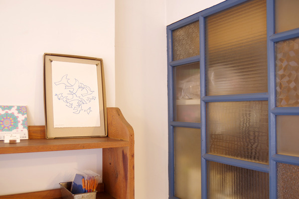 白壁にブルーの窓枠の室内窓があり、奥行きを感じさせてくれますね。