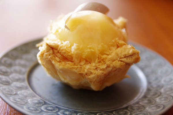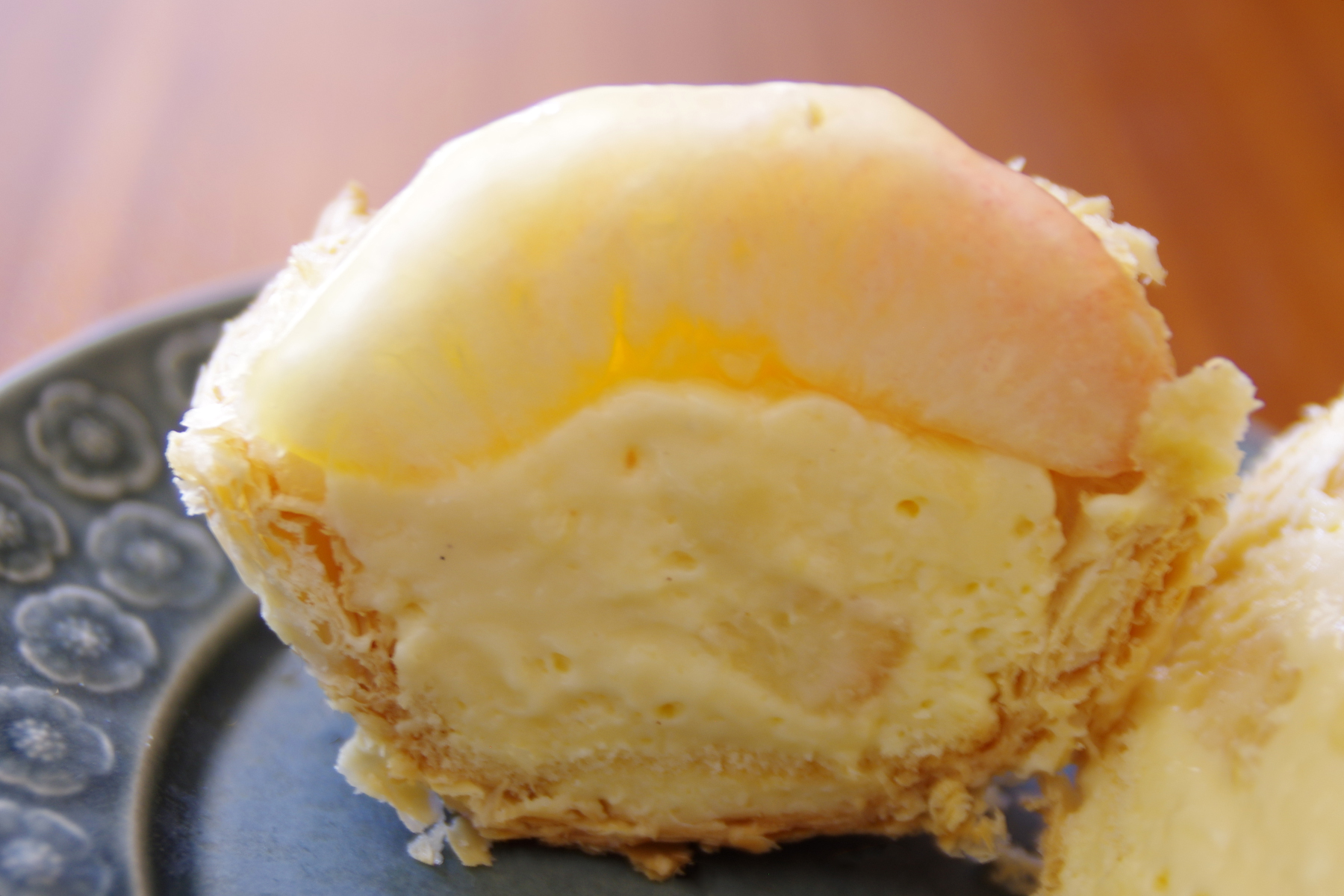 ザクザクのフィユタージュ(折りパイ)を土台に、ふわりと桃色をした半割りの桃が美しいですね。