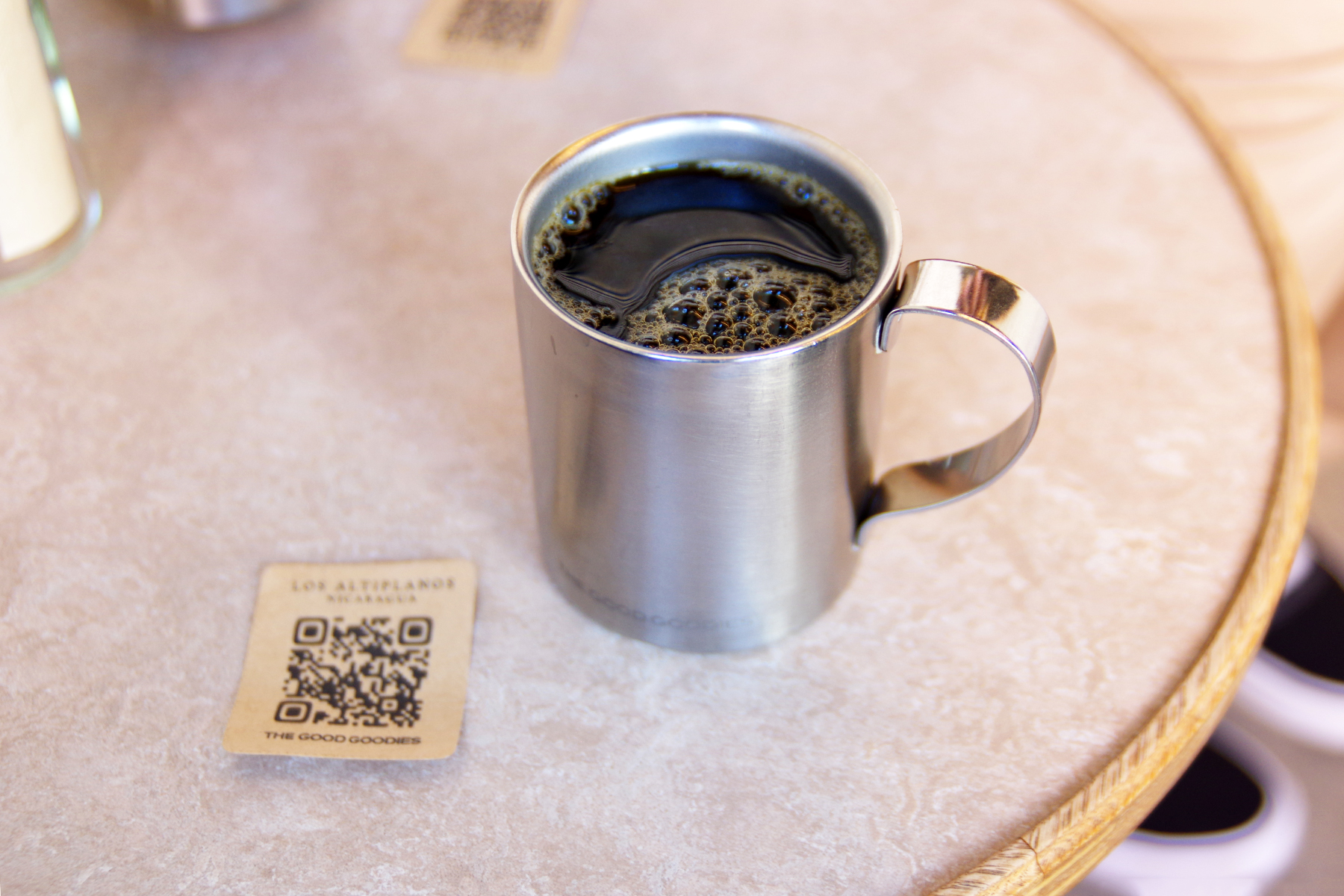 右側のコーヒースタンドでお会計をしてから、左側にあるテラス席へ(店内での写真は手元のみ2〜3枚OKでした)。お願いしたのはニカラグアのロス・アルティプラノス農園のナチュラル。ベリー系のふくよかな果実感と優しい甘さも感じられる一杯です。