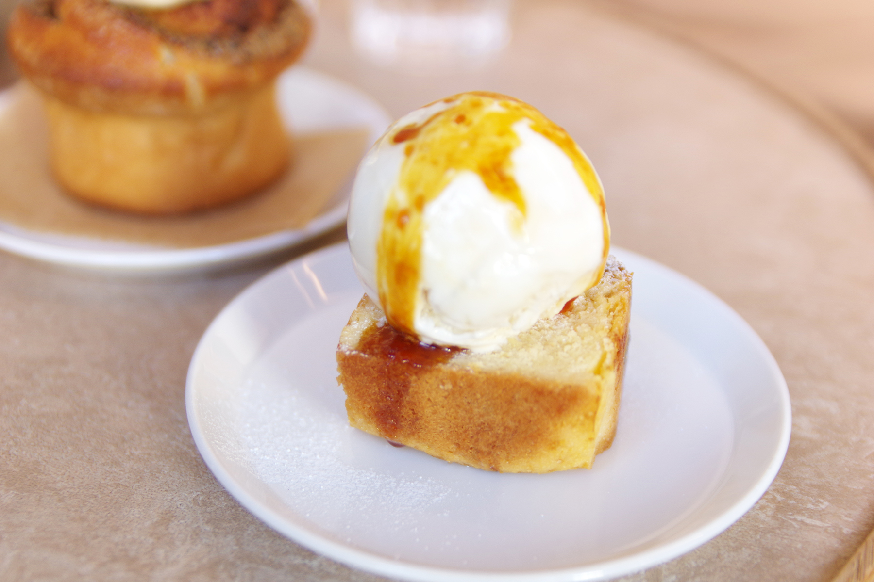 オーダーしたのはBAKED CAKE〜CARAMEL APPLE。キャラメリゼした紅玉とローストアーモンドが練り込まれたケーキはリベイクされて温かな状態で、その上に冷たいミルクアイスとキャラメルソースがかかっています。ホワッと温かなケーキに冷たいアイスをからめて一口、そしてコーヒーを一口、なんとも幸せな午後となりました。